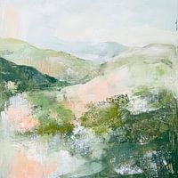 Zachte heuvels lopen harmonieus over in zacht groen, terwijl lichte pastelkleuren door het weidse landschap spelen. De diffuse lucht harmonieert met de zachte overgangen en creëert een bijna dromerige sfeer. Natuur en kunst smelten hier samen en de zintuigen worden uitgenodigd om te genieten van de rust en de schoonheid van het moment.