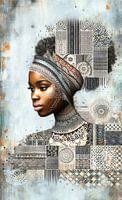 Een digitaal vervaardigd portret van een jonge Afrikaanse vrouw op een achtergrond van moderne vormen en figuren in vergrijsde kleuren.