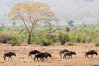 Gnoe (Connochaetes taurinus) kudde lopend in Kruger National Park in de zomer