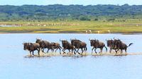 Gnoes galopperend door Lake Ndutu, Tanzania
