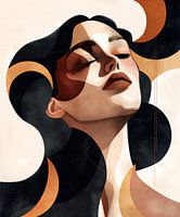 Een gestileerd portret van een vrouw met gesloten ogen en golvend haar, in warme en aardse tinten met sterk contrast. De abstracte compositie benadrukt de expressieve en serene emotie die in het portret is vastgelegd.