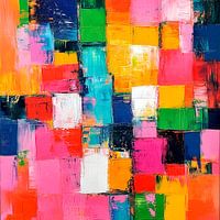 Abstract modern kunstwerk in de stijl van het kubisme, met kleurrijke vierkanten in een levendig kleurenpalet met impasto-techniek, het geheel geeft een vrolijke stemming en een levendige atmosfeer.