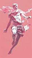 De sculptuur heeft een klassieke, mythologische uitstraling en roept associaties op met Griekse of Romeinse goden die symbool staan voor snelheid, vrijheid en harmonie. Zijn gespierde torso en vloeiende gewaad geven een gevoel van elegantie en kracht. De zachte roze achtergrond versterkt de dromerige sfeer en contrasteert subtiel met de marmeren structuur van de figuur. Door de dynamische pose en de opwaartse beweging lijkt het alsof de figuur zweeft of zich net heeft losgemaakt van de aarde.
