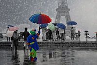 Parijs in de regen. Mensen met paraplu's op de Aussichtsplattforn op de Eiffeltoren, geparodieerd door een clown met kleurrijke paraplu.