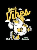 Een vectorillustratie van een vrolijke cartoonvogel die een skateboard draagt en een emmerhoed op heeft. De vogel loopt met een vastberaden uitdrukking en de tekst "Good Vibes" staat er in vette letters boven. De afbeelding is in pop-artstijl met felle kleuren en opvallende contouren. Het is een humoristische en relateerbare meme die vaak wordt gebruikt om positieve vibes en goede energie uit te drukken.