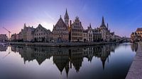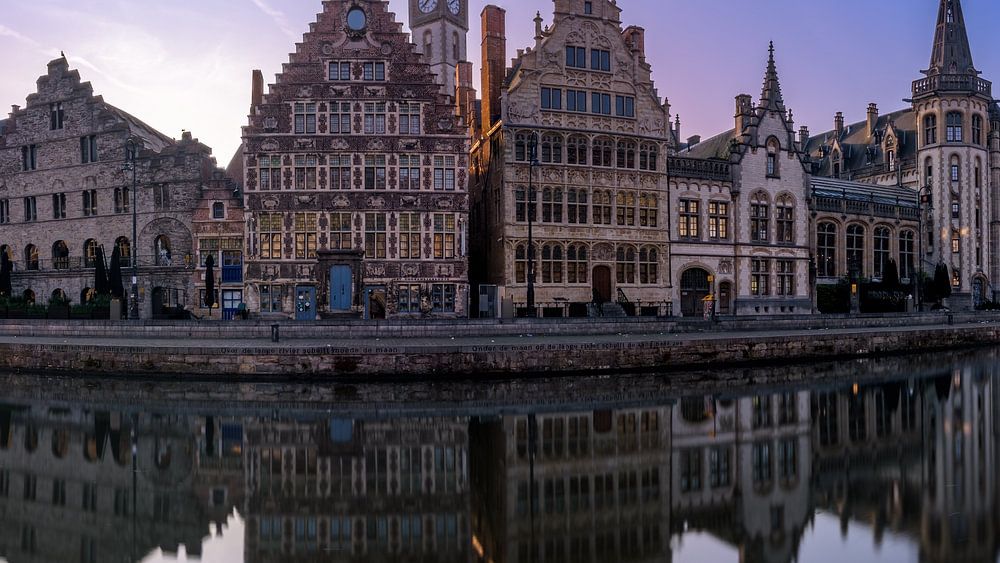 Panorama van zonsopkomst in het centrum van Gent aan de Leie. Vanaf de Korenlei kijk je over de Leie naar de prachtige oude gebouwen terwijl de zon nog net achter de middeleeuwse gebouwen schuilt