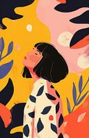 De boho stijl (kort voor bohemian style) is erg populair bij posters vanwege de unieke esthetiek en veelzijdige toepassingsmogelijkheden. Boho-stijl maakt vaak gebruik van natuurlijke motieven die een positieve sfeer creëren. De kleuren in bohostijl zijn meestal gedempt, met tinten als oker, terracotta, geel, olijfgroen en bruin. Deze warme kleuren geven woonruimtes een gezellige en uitnodigende sfeer en de posters passen gemakkelijk in de omgeving. Deze jonge vrouw geniet van het warme licht van de zonsopgang, de positieve stemming wordt overgebracht op de kijker.