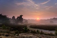 Prachtige zonsopkomst boven een mistig heideveld