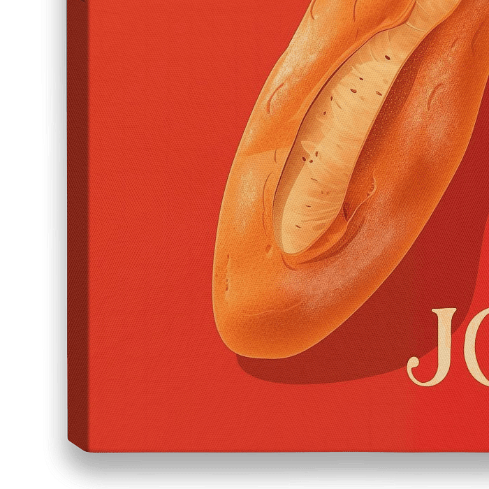 Een stijlvolle minimalistische kunstdruk van een stokbrood en de tekst "Bon Jour". Het hele stuk is in rode kleur.