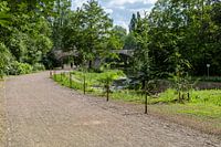 De foto toont een scène uit het Goethepark aan de Ilm in Weimar, genomen in de buurt van de Sternbrücke brug. Op de voorgrond is een zorgvuldig onderhouden tuin met bloeiende planten en struiken. Daarachter staat een houten hek dat de tuin scheidt van een ruime weide. De achtergrond wordt gedomineerd door dichte bomen en weelderig groen, terwijl zonnestralen door de gedeeltelijk bewolkte lucht breken.