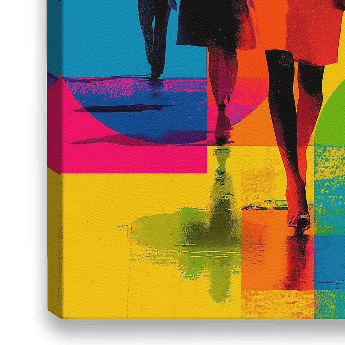Een kleurrijk kunstwerk met silhouetten van figuren die lopen tegen een heldere achtergrond van geometrische vormen en felle kleuren. De compositie combineert abstracte elementen met een dynamisch kleurenpalet, wat een levendige, stedelijke sfeer creëert.