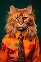 Een majestueuze Maine Coon kat gekleed in een levendig oranje overhemd met een kleurrijk bloemenpatroon en een zorgvuldig geknoopte rijk gedecoreerde stropdas, klaar om uit te gaan. Kunst met een knipoog.