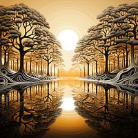 "Gold Forest," a series of captivating artworks, presents an enigmatic exploration of nature's majesty through a lens of gold and shadow. In this particular piece, the black forms reach skyward like ancient trees, their edges kissed with glimmers of gold, creating a forest that resonates with both grandeur and mystery. The interplay between darkness and light, solidity and ethereality, crafts a visual poetry that speaks to the timeless allure of the wilderness. It's a world where nature's simplicity is adorned with a touch of opulence, inviting the viewer into a golden forest that exists somewhere between reality and imagination.