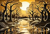 "Gold Forest," a series of captivating artworks, presents an enigmatic exploration of nature's majesty through a lens of gold and shadow. In this particular piece, the black forms reach skyward like ancient trees, their edges kissed with glimmers of gold, creating a forest that resonates with both grandeur and mystery. The interplay between darkness and light, solidity and ethereality, crafts a visual poetry that speaks to the timeless allure of the wilderness. It's a world where nature's simplicity is adorned with a touch of opulence, inviting the viewer into a golden forest that exists somewhere between reality and imagination.