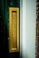 Gouden verticale brievenbus in de deur, een traditionele manier om brieven aan een huis te bezorgen. In 2020 is Dordrecht 800 jaar een stad en daarmee de oudste stad van Zuid-Holland. Het jubileum wordt door ons gemarkeerd met een collectie brievenbussen die in de historische stad Dordrecht zijn gevonden. Fotografie: Iris de Reus