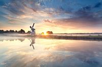 Dutch windmill reflected in river and beautiful misty sunrise. Netherlands