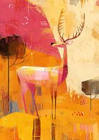 Golden Antlers Reign - Dit dieren schilderij toont een statig hert in een abstracte, kleurrijke omgeving met gestileerde planten en bomen, waarbij de tinten geel, rood en oranje overheersen.