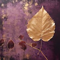 Gouden blad op een rijke paarse achtergrond, waarbij de combinatie van kleuren en texturen een gevoel van luxe en diepte oproept. De achtergrond heeft een abstracte kwaliteit, met vegen en spatten die een organische en tegelijkertijd kosmische sfeer suggereren. Het contrasterende gouden blad, dat met zijn gedetailleerde nerven en symmetrie de natuurlijke wereld vertegenwoordigt, wordt verheven tot iets kostbaars en kunstzinnigs.