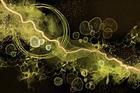 Abstract schilderij in zwart en goud. Gouden cirkel met gouden glans en gouden druppels
