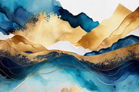 Het schilderij heeft een scala aan texturen en vormen, van gekartelde pieken tot vloeiende rondingen, die samen een verbluffende en boeiende scène vormen. De gouden tinten in het schilderij geven de indruk van zonlicht dat weerkaatst op de bergoppervlakken, wat een gevoel van uitstraling en majesteit toevoegt. Het berglandschap in "Golden Crests" nodigt de kijker uit om na te denken over de kracht en grootsheid van de natuur en de schoonheid die in de natuurlijke wereld te vinden is.