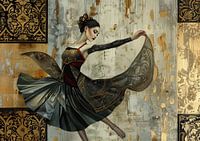 Golden Dance Silhouette - Dit vrouwen schilderij toont een elegante danseres in een dramatisch zwart en goud gedecoreerde jurk tegen een achtergrond van verweerde, vergulde patronen.