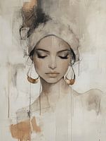 Deze afbeelding toont een serene, abstracte voorstelling van een vrouw met een ingetogen blik en zachte, gedempte kleuren. De gouden oorbellen die ze draagt vormen een subtiele maar krachtige focus in het werk, die de ingetogen eenvoud doorbreekt met een vleugje luxe. De penseelstreken zijn licht en vloeiend, wat de compositie een dromerige sfeer geeft. Haar gesloten ogen en delicate gezichtsexpressie stralen kalmte en introspectie uit. Het werk combineert zowel abstracte als figuratieve elementen, en de balans tussen licht en schaduw geeft het een etherische, tijdloze kwaliteit.