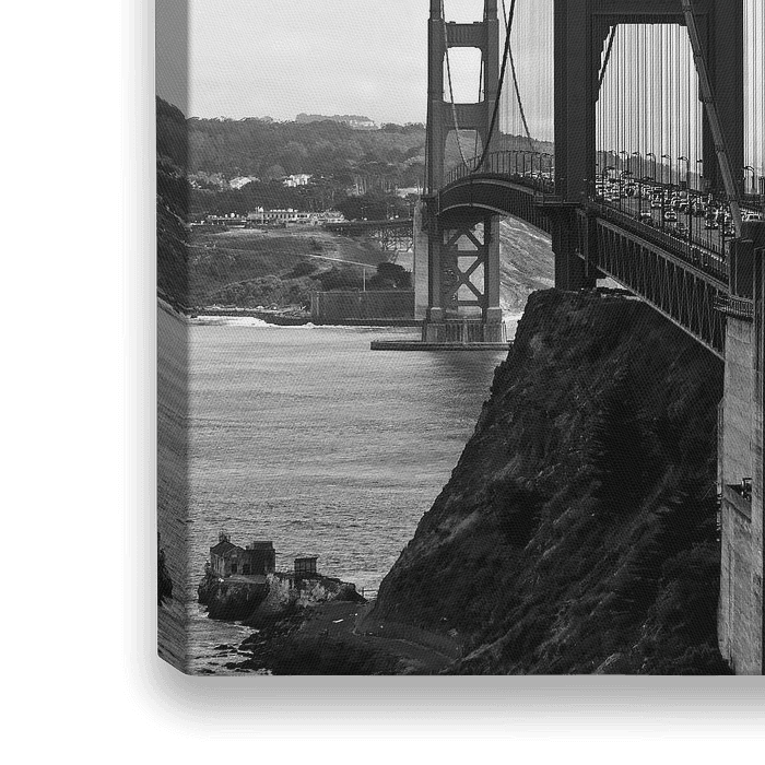 Een dynamisch zwartwit van de Golden Gate Bridge in San Francisco waarbij de volledige brug is afgebeeld met daarop het rijdende verkeer ziet tijdens de drukke ochtendspits.