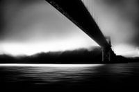 De mist was al iets opgetrokken, zodat het water en de machtige pijlers van de brug duidelijk zichtbaar waren.