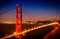 De San Francisco Bay met uitzicht op de stad van de Golden Gate Bridge, de beroemde bezienswaardigheid van San Francisco. De verlichte brug werd hier gefotografeerd tijdens het blauwe uur na zonsondergang. Een mooie avond sfeer!