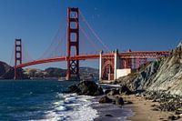 Uitzicht vanaf Marshalls Beach naar de Golden Gate Bridge in het avondlicht in San Francisco, Californië, VS.