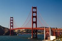 Uitzicht vanaf Marshalls Beach naar de Golden Gate Bridge in het avondlicht in San Francisco, Californië, VS.