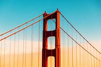 Een blik van dichtbij isoleert de toren en het fijne ritme van kabels tegen een heldere hemel. Kleur en licht vereenvoudigen de vormen in vlakken van rode, blauwe en warme tinten, waardoor de bekende structuur verandert in een elegante studie van proporties. De afwezigheid van afleiding laat de architectuur spreken in lijnen, intervallen en balans.