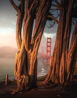 Warm licht strijkt over de stammen van de kustcipres terwijl de Golden Gate daarachter oprijst in een zachte nevel. De bomen vormen een natuurlijk kader dat het oog naar de toren en de kabels over de zeestraat leidt. De structuur van de schors, de glooiende grond en de branding in de verte voegen diepte en een sterk gevoel van plaats toe. De compositie verenigt organische vormen met verfijnde techniek in een kalm en evenwichtig uitzicht.