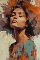 Een meditatief portret waar een vrouw met gesloten ogen in volkomen rust verkeert, omgeven door een explosie van warme tinten—goud, terracotta en diepbruin—die haar geest lijken te weerspiegelen. Het gestileerde portet combineert fotorealistische gezichtstrekken met abstracte veegstreken, waardoor interieure kalmte en externe…
