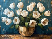 Golden Grace - Dit bloemenschilderij vertoont een levendige verzameling witte tulpen, kunstzinnig afgebeeld met gouden accenten tegen een donkerblauwe achtergrond.