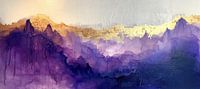 Golden Haze Adventure - Dit abstracte schilderij toont gelaagde paarse en blauwe bergen met gouden accenten die nevelige ochtendlicht suggereren.