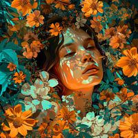 Een vrouw in een bloemenveld. De compositie is gelaagd en complex, met uiterst gedetailleerde bladeren die het tafereel vullen. In de afbeelding komen licht en schaduw samen om diepte en drama toe te voegen aan het verhaal van het portret.