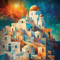 Schilderachtige weergave van een mediterraans dorp, geïnspireerd door de architectuur van de Griekse eilanden met hun karakteristieke witgekalkte gebouwen en afgeronde koepels. De compositie is rijk aan texturen en lagen, wat een collageachtig effect creëert, waarbij verschillende elementen van de scene overlappen en samensmelten. De kleuren zijn warm en uitnodigend, met tinten van oranje, blauw en crème die de huizen en de hemel vullen.