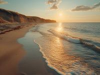 Het gouden uur omhult het verlaten strand in een warme, betoverende gloed. Het water schittert in gouden en amberkleurige reflecties en een serene stilte hangt in de lucht, puur en ongestoord.