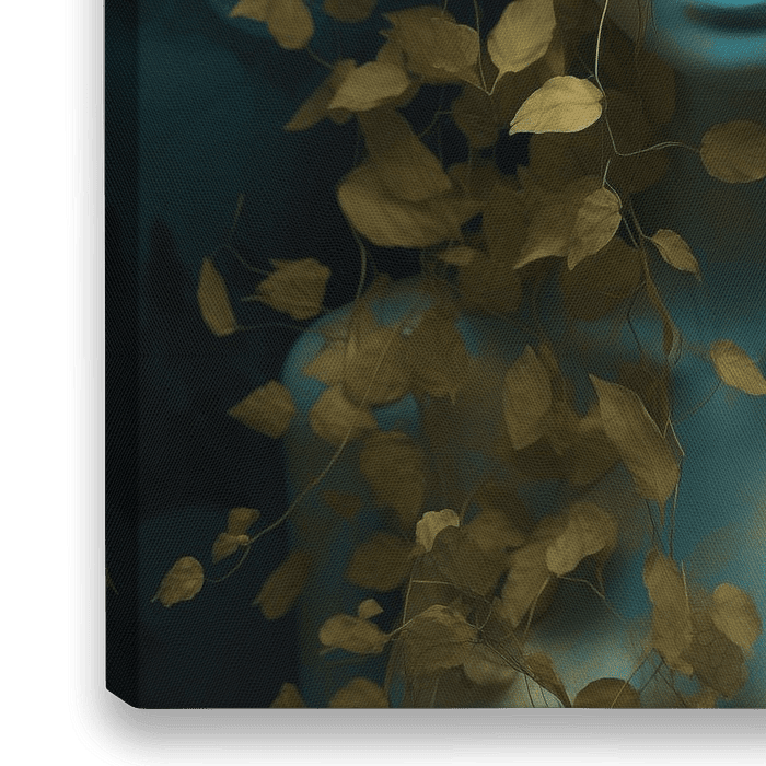 Haar gezicht wordt gedeeltelijk verborgen door delicate, gouden takken en bladeren, die naadloos overgaan in de etherische, blauwgroene achtergrond. De samensmelting van natuurlijke elementen en mystieke tinten creëert een dromerige sfeer.