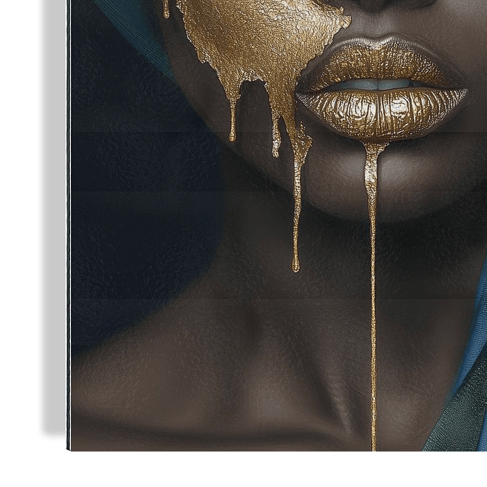 Een abstract portret van een donkere vrouw met hoofddoek, deels bedekt met gouden verf.