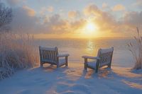 Golden Morning Whisper - Dit landschap schilderij toont een serene winterochtend aan de Nederlandse kust met besneeuwde bankjes en een gouden zonsopkomst die een magische gloed over het alles werpt.