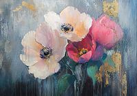 Golden Petals - Dit bloemen schilderij toont een groep levendige, kleurrijke bloemen met een textuurrijke achtergrond, waarbij de nadruk ligt op de contrasterende zachtheid van de bloemen tegen het ruwe, donkere canvas, verrijkt met gouden accenten die elegantie en vitaliteit aan de compositie toevoegen.