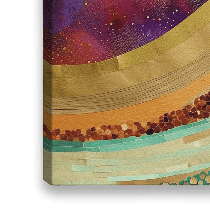 Een kleurrijk digitaal schilderij genaamd "Golden Rainbow" met een kleurenpallet met gouden en lila elementen. Het werk geeft een warme en klassieke uitstraling aan uw interieur!
