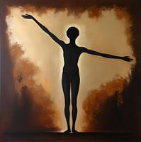 Een intrigerend abstract schilderij in warme bruin-, beige- en goudtinten, waarin een mysterieuze figuur met lange, uitgestrekte armen centraal staat. De vloeiende lijnen en gelaagde texturen creëren een gevoel van beweging en balans, terwijl de gouden accenten diepte en elegantie toevoegen. De vervormde proporties geven het werk een…