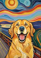 Een golden retriever neemt een onverwachte dramatische vorm aan, zijn vriendelijke gezicht verandert in een brede, expressieve schreeuw omringd door vibrerende, golfachtige penseelstreken. Warme gelen en diepe schaduwen stromen door de lucht en creëren een surrealistische sfeer die Munch's iconische emotionele energie weerspiegelt. Dit…