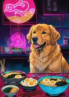 Golden Retriever voor ramen noodle in kom met ramen winkel achtergrond