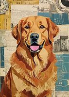 Een vintage papiercollage van een Golden Retriever, met de vriendelijke en speelse aard van het ras's door middel van warm, gestructureerd papier en zachte, gouden tinten. Het werk combineert ingewikkelde lagen en gladde details en brengt de loyale en liefdevolle geest van deze geliefde metgezel over in een artistieke, nostalgische stijl.