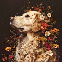 Golden Retriever met bloemen uit een serie hondenrassen met wilde bloemen, digitaal gemaakt met behulp van AI en photoshop. Een mooi contrast met de diverse bloemen op de zachte achtergrond.