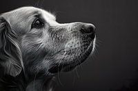 Op de zwart-wit close-up foto tegen een licht donkere achtergrond straalt een Golden Retriever vriendelijkheid uit. Zijn zachte, golvende vacht is vol details zichtbaar. De ogen, groot en liefdevol, kijken met een kalme intelligentie. Zijn neus is vochtig en glanzend, terwijl de oren ontspannen hangen, accentuerend zijn zachtaardige en trouwe aard.